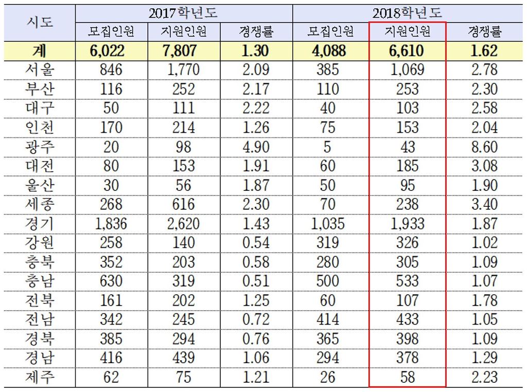 [아시아경제 이민우 기자] 교원 정원 감소로 '임용절벽' 우려를 불러일으켰던 전국 2018학년도 초등교사 임용시험 경쟁률이 지난해 소폭 상승한 1.62대1로 최종 집계됐다. 최근 3년 간 미달됐던 강원·경북·충남·충북·전남 등 5개 지역도 경쟁률 1대1을 넘어섰다.10일 교육부의 '2018학년도 시·도교육청 초등교원 임용시험 응시원서 접수 결과'에 따르면 4088명을 모집하는 올해 초등교원 임용시험에 총 6610명이 지원했다. 경쟁률은 1.62대1이다. 6022명 모집에 총 7807명이 지원했던 지난해 경쟁률 1.30대1 보다 조금 올랐다.최근 3년간 지원자 수가 모집 정원보다 적어 미달했던 강원·경북·충남·충북·전남 등 5개 지역도 경쟁률 1대1을 넘겼다. 이로써 모든 지역이 미달하지 않게 됐다. 지난해 이들 지역의 경쟁률은 강원 0.49대1, 충북 0.56대1, 충남 0.48대1, 전남 0.7대1, 경북 0.73대1 이었다. 세부적으로는 365명 모집에 398명이 지원한 경북과 280명 모집에 305명이 지원한 충북은 모두 1.09대1을 기록했다. 이어 충남 1.07대1(500명 모집에 533명 지원), 전남 1.05대1(414명 모집에 433명 지원)의 경쟁률을 보였다. 동영상까지 만들며 임용 시험 지원을 독려했던 강원도는 319명 모집에 326명이 지원, 17개 시도 중 가장 낮은 1.02대1의 경쟁률을 기록했다.이는 교육당국이 서울과 수도권을 중심으로 초등교원 선발 인원을 축소하면서 서울과 수도권에 몰렸던 교대생들이 각자의 지역으로 지원하게 된 결과로 보인다. 인기가 많은 서울 지역의 경우 올해 공립 초등학교 교원 선발인원은 지난해(846명)의 절반에도 못 미치는 385명으로 줄었다.한편 여전히 도시 지역이 선호도가 높아 높은 경쟁률을 보였다. 광주는 5명 모집에 43명이 지원해 전국에서 가장 높은 8.6대1의 경쟁률을 기록했다. 지난해(4.9대1)보다 2배 가까이 상승한 수치다. 이는 1986년 광역시와 도 지역의 순환 근무가 중단되기 직전 40대 초반 교사들이 대거 광주로 전입, 30대의 저경력 교사들은 모두 전남으로 밀려났기 때문으로 풀이된다. 박남기 광주교대 교수는 "40대 교사는 많지만 30대 교사는 거의 없는 구조가 돼 타 지역은 당시 30대 교사 들이 퇴직할 시기이지만 광주는 퇴직자가 없는 상황이 됐다"고 설명했다.그 밖에 세종(3.4대1), 대전(3.08대1), 서울(2.78대1), 대구(2.58대1), 부산(2.3대1), 인천(2.04대1)등의 순이었다.2018년 초등교원 임용시험 응시원서 접수 결과(제공=교육부)