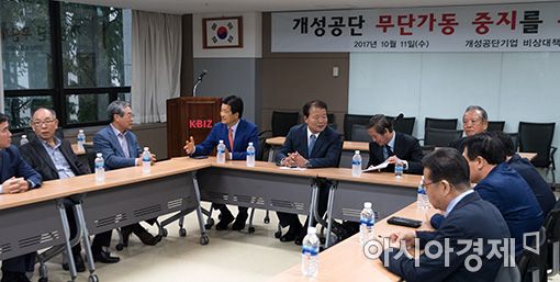 [아시아경제 윤동주 기자] 신한용 개성공단기업협회 비대위원장(앞줄 왼쪽 두번째)등 개성공단 입주 기업인들이 11일 서울 여의도 중소기업중앙회에서 비상대책회의를 갖고 있다.윤동주 기자 doso7@asiae.co.kr<ⓒ세계를 보는 창 경제를 보는 눈, 아시아경제(www.asiae.co.kr) 무단전재 배포금지>