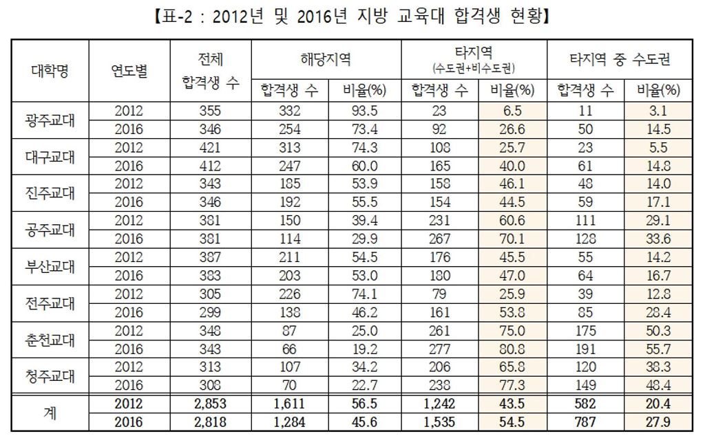 [아시아경제 이민우 기자] 지방교대의 서울 경기 등 수도권 출신 학생 비중이 늘어나고 있다. 수도권 지역의 초등 교원 채용 인원 감소로 '임용절벽'이 다가오는 만큼 이 같은 상황은 더욱 심해질 것으로 전망된다.11일 국회 교육문화체육관광위원회 소속 오영훈 더불어민주당 의원이 교육부로부터 제출받은 '전국 교육대학교 지원 및 합격생 현황'을 통해 서울교대와 경인교대를 제외한 8개 지방교대 입학 지원현황을 분석한 결과 수도권을 비롯한 타지역 학생들의 지방 교대 집중 현상이 최근 들어 뚜렷하게 증가된 것으로 나타났다.2012년 및 2016년 지방 교육대 합격생 현황(제공=오영훈 더불어민주당 의원실)