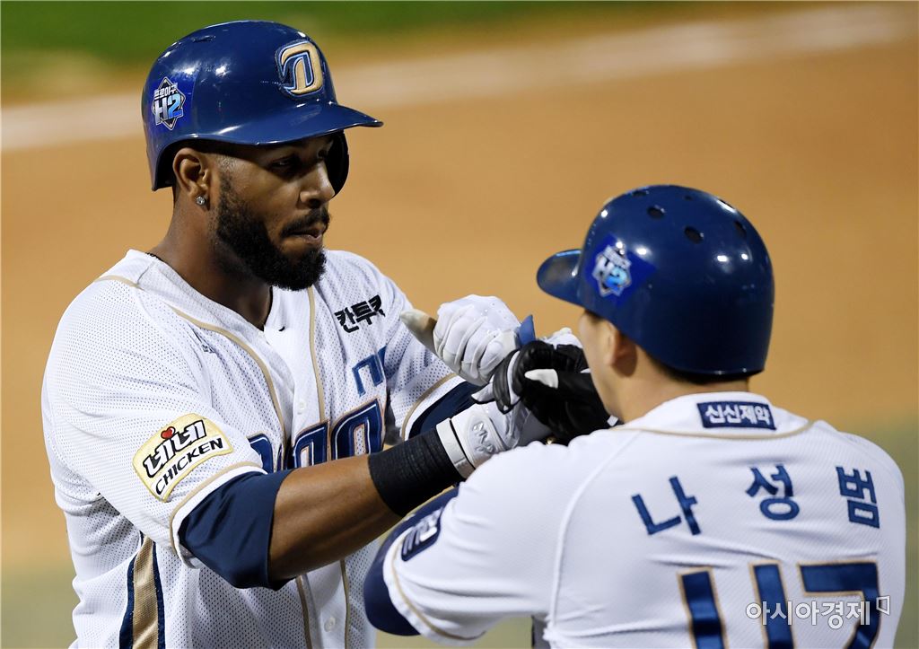 [창원=아시아경제 김현민 기자]프로야구 롯데 자이언츠와 NC 다이노스이 2017 KBO리그 준플레이오프 3차전이 11일 창원 마산야구장에서 열렸다. 1회말 2사 1루에서 NC 스크럭스가 롯데 선발 송승준을 상대로 선제 투런 홈런을 치고 선행주자 나성범과 하이파이브하고 있다. 김현민 기자 kimhyun81@asiae.co.kr<ⓒ세계를 보는 창 경제를 보는 눈, 아시아경제(www.asiae.co.kr) 무단전재 배포금지>