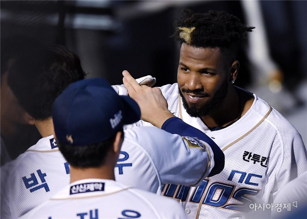 [창원=아시아경제 김현민 기자]프로야구 롯데 자이언츠와 NC 다이노스이 2017 KBO리그 준플레이오프 3차전이 11일 창원 마산야구장에서 열렸다. 1회말 2사 1루에서 NC 스크럭스가 롯데 선발 송승준을 상대로 선제 투런 홈런을 치고 박민우와 세리머니하고 있다. 김현민 기자 kimhyun81@asiae.co.kr<ⓒ세계를 보는 창 경제를 보는 눈, 아시아경제(www.asiae.co.kr) 무단전재 배포금지>