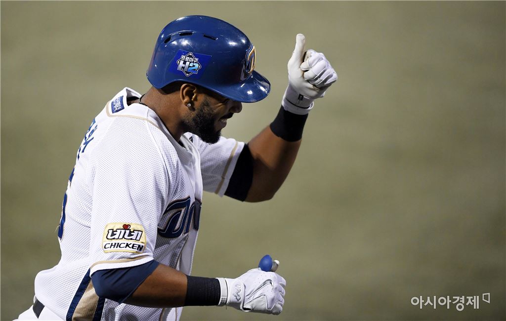 [창원=아시아경제 김현민 기자]프로야구 롯데 자이언츠와 NC 다이노스이 2017 KBO리그 준플레이오프 3차전이 11일 창원 마산야구장에서 열렸다. 1회말 2사 1루에서 NC 스크럭스가 롯데 선발 송승준을 상대로 선제 투런 홈런을 치고 세리머니하고 있다. 김현민 기자 kimhyun81@asiae.co.kr<ⓒ세계를 보는 창 경제를 보는 눈, 아시아경제(www.asiae.co.kr) 무단전재 배포금지>