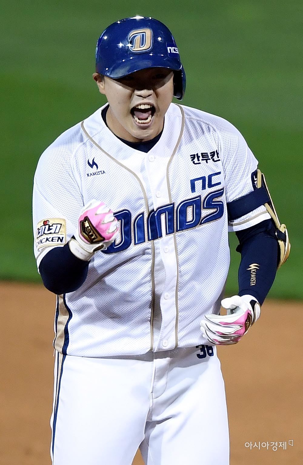 [창원=아시아경제 김현민 기자]프로야구 롯데 자이언츠와 NC 다이노스이 2017 KBO리그 준플레이오프 3차전이 11일 창원 마산야구장에서 열렸다. 1회말 2사 1,2루에서 NC 권희동이 추가 1타점 적시타를 치고 환호하고 있다. 김현민 기자 kimhyun81@asiae.co.kr<ⓒ세계를 보는 창 경제를 보는 눈, 아시아경제(www.asiae.co.kr) 무단전재 배포금지>