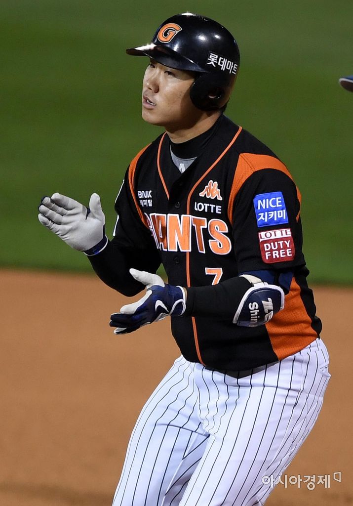 [창원=아시아경제 김현민 기자]프로야구 롯데 자이언츠와 NC 다이노스이 2017 KBO리그 준플레이오프 3차전이 11일 창원 마산야구장에서 열렸다. 2회초 2사 만루에서 롯데 신본기가 1타점 적시타를 치고 박수치며 기뻐하고 있다. 김현민 기자 kimhyun81@asiae.co.kr<ⓒ세계를 보는 창 경제를 보는 눈, 아시아경제(www.asiae.co.kr) 무단전재 배포금지>