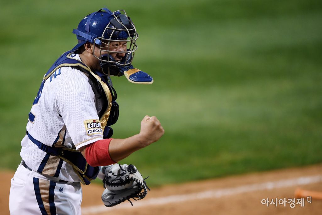 [창원=아시아경제 김현민 기자]프로야구 롯데 자이언츠와 NC 다이노스이 2017 KBO리그 준플레이오프 3차전이 11일 창원 마산야구장에서 열렸다. 6회초 1사 만루에서 NC 김태군 포수가 롯데 박헌도의 우익수 뜬공 때 태그업을 시도한 3루주자 전준우를 태그아웃시키고 환호하고 있다. 김현민 기자 kimhyun81@asiae.co.kr<ⓒ세계를 보는 창 경제를 보는 눈, 아시아경제(www.asiae.co.kr) 무단전재 배포금지>
