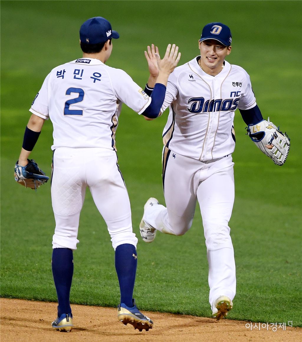 [창원=아시아경제 김현민 기자]프로야구 롯데 자이언츠와 NC 다이노스이 2017 KBO리그 준플레이오프 3차전이 11일 창원 마산야구장에서 열렸다. 6회초 1사 만루에서 NC 우익수 나성범이 롯데 박헌도의 뜬공을 잡아낸 뒤 태그업을 시도한 3루주자 전준우를 아웃시킨 뒤 박민우와 기뻐하고 있다. 김현민 기자 kimhyun81@asiae.co.kr<ⓒ세계를 보는 창 경제를 보는 눈, 아시아경제(www.asiae.co.kr) 무단전재 배포금지>
