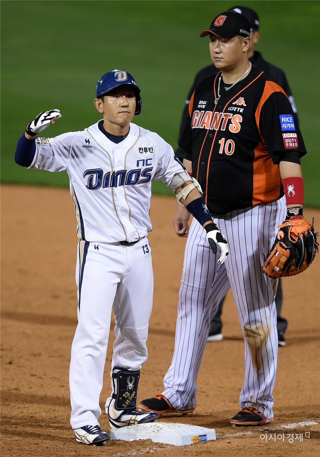 [창원=아시아경제 김현민 기자]프로야구 롯데 자이언츠와 NC 다이노스이 2017 KBO리그 준플레이오프 3차전이 11일 창원 마산야구장에서 열렸다. 6회말 2사 1,2루에서 NC 손시헌이 추가 1타점 적시타를 치고 기뻐하고 있다. 김현민 기자 kimhyun81@asiae.co.kr<ⓒ세계를 보는 창 경제를 보는 눈, 아시아경제(www.asiae.co.kr) 무단전재 배포금지>