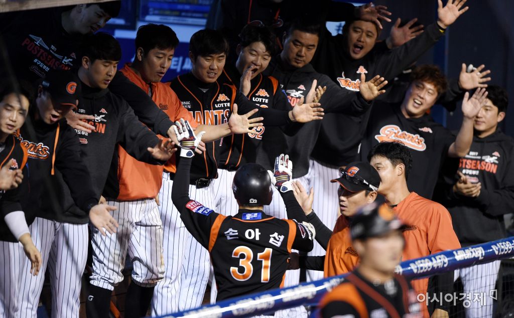 [창원=아시아경제 김현민 기자]프로야구 롯데 자이언츠와 NC 다이노스이 2017 KBO리그 준플레이오프 3차전이 11일 창원 마산야구장에서 열렸다. 8회초 1사 1루에서 롯데 손아섭이 NC 임정호를 상대로 투런 홈런을 치고 동료들과 기뻐하고 있다. 김현민 기자 kimhyun81@asiae.co.kr<ⓒ세계를 보는 창 경제를 보는 눈, 아시아경제(www.asiae.co.kr) 무단전재 배포금지>