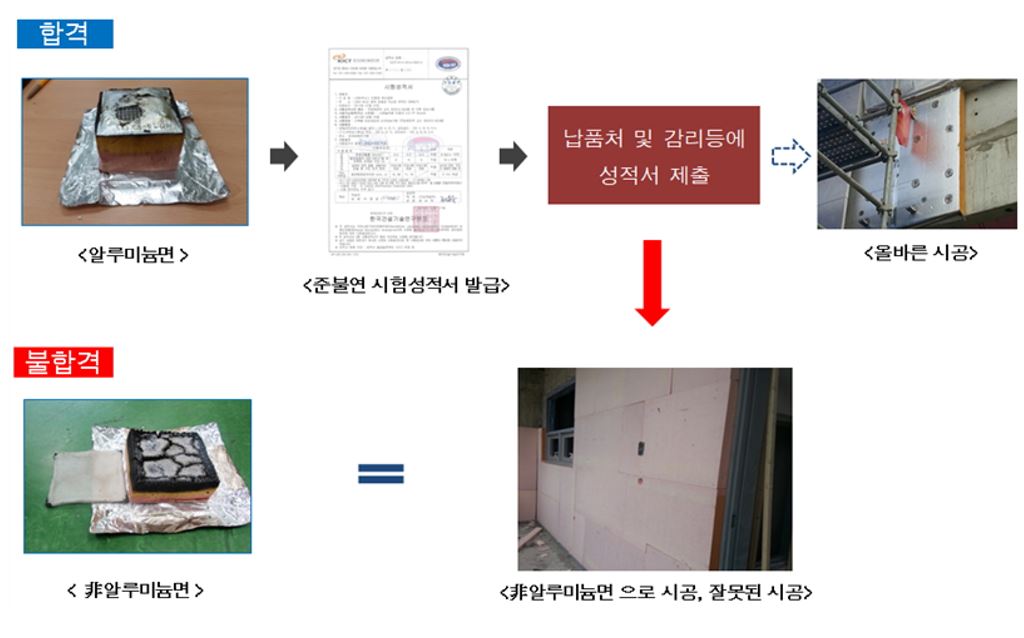 문제는 건설현장에서 면에 따라 난연 성능이 다르다는 것을 인식하지 못하고 있다는 점이다. 알루미늄 면제가 없는 면을 사용하는 편법시공이 99% 이상이라는 게 김 의원의 설명이다. 김 의원은 "알루미늄 면재가 있는 면으로는 접착력이 약해 사용하기 어려워 99% 이상 이런 방식으로 시공한다"는 내용의 아파트 건설현장 관계자의 증언을 확보했다. 김 의원은 "화재안전 성능이 불완전한 단열재가 잘못된 방법으로 시공되고 있어 화재 발생 시 상당히 우려스럽다"면서 "철저한 관리·감독이 필요하고 건축안전모니터링 점검 대상에 외벽마감재를 포함하는 등 현실성 있는 대책을 마련해야 한다"고 말했다.또 김 의원은 "손바닥 크기의 단열재 시료 시험으로는 화재 성능을 제대로 평가하기 어려운 만큼 유럽 등 선진국과 같이 실제의 화재현장을 재연해 구조 및 성능을 판정하는 실물화재시험을 즉시 도입해야 한다"고 덧붙였다. 류정민 기자 jmryu@asiae.co.kr<ⓒ세계를 보는 창 경제를 보는 눈, 아시아경제(www.asiae.co.kr) 무단전재 배포금지>