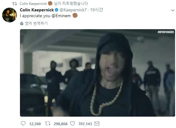 이에 ‘NFL 무릎꿇기’를 시작한 전 샌프란시스코 포티나이너스 쿼터백 콜린 캐퍼닉은 자신의 트위터를 통해 “에미넴에게 감사한다”는 글을 올렸다.