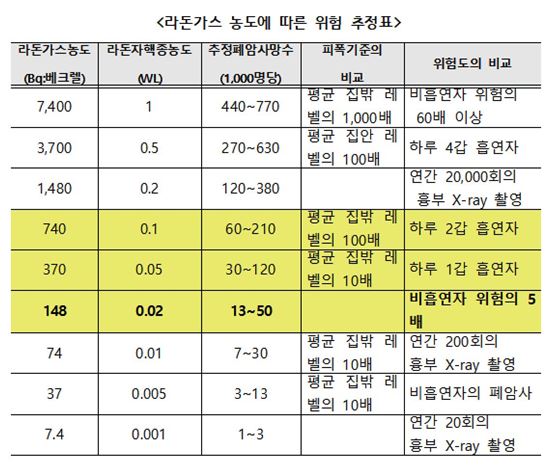 [아시아경제 이민우 기자] 폐암을 유발하는 방사성 위해가스 '라돈'이 기준치의 12배 이상 검출되고 있는데도 제대로 된 관리가 이뤄지지 않고 있는 것으로 드러났다.12일 국회 교육문화체육관광위원회 소속 노웅래 더불어민주당 의원은 이날 열린 교육부 국정감사에서 이 같은 부분을 지적했다. 라돈(Rn, Radon)은 지각을 구성하는 암석·토양 등에 있는 우라늄이 핵분열할 때 발생하는 방사성 가스로 색도, 맛도, 냄새도 없는 대표적 발암물질이다. 흡연에 이어 두 번째로 폐암을 일으키는 1급 발암물질로 연간 자연 방사선 노출량의 절반 가까이를 차지한다. 한국환경정책평가연구원의 연구에 따르면 한국의 전체 폐암사망자 중 12.6%가 실내 라돈에 의한 것으로 추정됐다.노 의원은 "학교보건법에서는 실내라돈 유지기준은 148베크렐(Bq)로 규정하고 있지만 2014년 교육부의 조사에 따르면 충북의 한 초등학교에서는 1770베크렐이 측정됐다"며 "이는 하루 담배 3갑을 피는 것과 맞먹는 정도로 폐암을 유발할 위험이 있는 수준"이라고 비판했다.라돈가스 농도에 따른 위험 추정표(제공= 노웅래 더불어민주당 의원실)