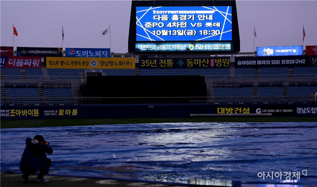 [창원=아시아경제 김현민 기자]12일 창원 마산야구장에서 열릴 예정이었던 프로야구 롯데 자이언츠와 NC 다이노스의 준플레이오프 4차전이 우천으로 취소됐다. 방수포 덮힌 마산구장 전경. 김현민 기자 kimhyun81@asiae.co.kr<ⓒ세계를 보는 창 경제를 보는 눈, 아시아경제(www.asiae.co.kr) 무단전재 배포금지>