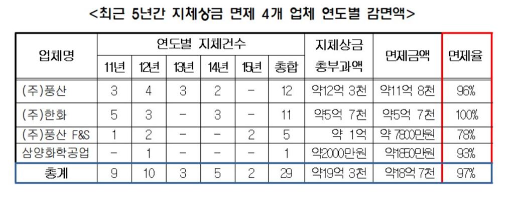 업체별로보면 (주)한화는 부과받은 지체상금 약5억7000만원을 모두 면제받았고 (주)풍산은 약12억3000만원 지체상금중 약11억8000억원을 면제받아 96%를 면제받았다. 삼양화학공업은 약2000만원 중 약1850만원을 면제받았고 (주)풍산 F&S는 약1억원의 지체상금 중 약7800만원을 면제받았다. 면제율로 보면 각각 93%, 78%에 달한다.수락시험이 연말에 집중돼 기간 지체와 납품 지연이 반복적으로 발생하고 있지만 업체는 지체상금이 사실상 전액 면제되고 있어 적시 납품의 필요성을 느끼지 못하고 있다는 지적이 나온다. 우 의원은 "국과연 수락시험 지체의 사유로 발생한 지체상금도 사실상 전액 면제해 납품 지연에 대한 책임을 국가가 고스란히 떠안고 있다"며 "방사청이 수락시험부터 납품까지의 전 일정을 고려한 사업추진방안을 마련해야 한다"고 말했다.이설 기자 sseol@asiae.co.kr<ⓒ세계를 보는 창 경제를 보는 눈, 아시아경제(www.asiae.co.kr) 무단전재 배포금지>