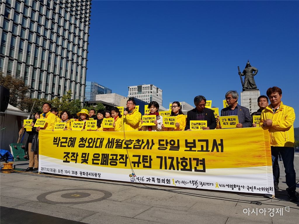 세월호참사 유가족들이 13일 오전 10시30분 서울 종로구 광화문광장에서 '박근혜 정부의 세월호참사 당일 보고서 조작 및 은폐공작 규탄 기자회견'을 열고 있다.