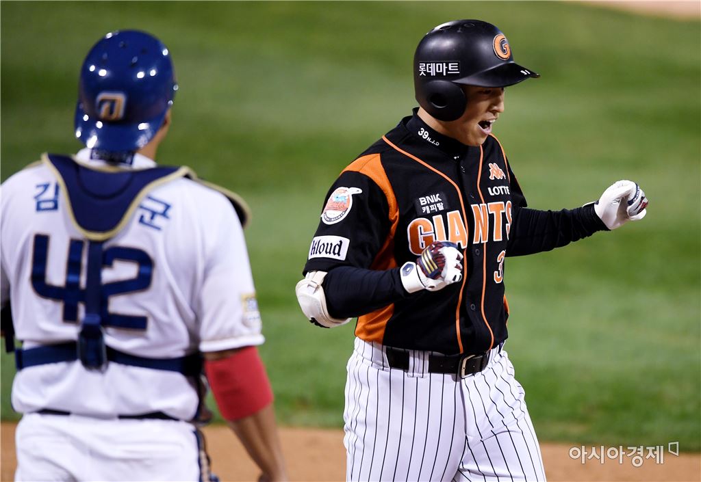 [창원=아시아경제 김현민 기자]프로야구 롯데 자이언츠와 NC 다이노스의 2017 KBO리그 준플레이오프 4차전이 13일 창원 마산야구장에서 열렸다. 5회초 2사 1,2루에서 롯데 손아섭이 추가 3점 홈런을 치고 환호하고 있다. 김현민 기자 kimhyun81@asiae.co.kr<ⓒ세계를 보는 창 경제를 보는 눈, 아시아경제(www.asiae.co.kr) 무단전재 배포금지>