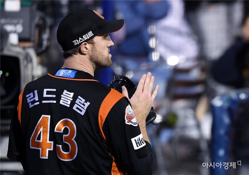[창원=아시아경제 김현민 기자]프로야구 롯데 자이언츠와 NC 다이노스의 2017 KBO리그 준플레이오프 4차전이 13일 창원 마산야구장에서 열렸다. 롯데 선발투수 린드블럼이 8회말 2사 3루에서 NC 나성범을 우익수 뜬공으로 처리한 뒤 박수치고 있다. 김현민 기자 kimhyun81@asiae.co.kr<ⓒ세계를 보는 창 경제를 보는 눈, 아시아경제(www.asiae.co.kr) 무단전재 배포금지>