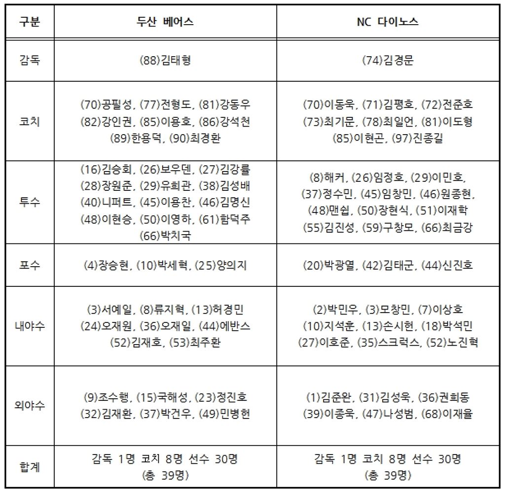 [아시아경제 박병희 기자] 프로야구 두산 베어스와 NC 다이노스가 2017 타이어뱅크 KBO리그 플레이오프에 출장할 선수 30명 명단을 공개했다. 두산이 투수 열세 명을 포함시킨 반면 NC는 열두 명으로 한 명 적다. NC는 대신 내야수를 두산보다 한 명 더 넣었다. NC는 준플레이오프 때와 동일한 선수로 30명 명단을 꾸렸다. 두산은 김재호를 출전선수 명단에 포함시켰다. 김재호는 8월29일 롯데 자이언츠와 잠실 홈경기에서 파울 타구를 잡으려다 동료 수비수와 충돌하며 왼쪽 어깨를 다쳤고 이후 경기를 나서지 못 했다. 김태형 두산 감독은 "김재호의 컨디션이 100%는 아니지만, 수비는 얼마든지 할 수 있다. 선발은 무리지만 중요한 상황에 대수비로 나갈 수 있다"고 했다.두산와 NC는 17일 오후 6시30분 서울 잠실야구장에서 플레이오프 1차전을 한다.