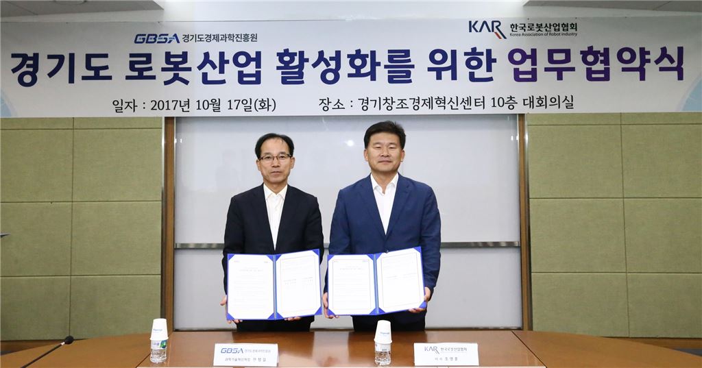 한정길 경기경제과학원 과학기술혁신처장과 조영훈 한국로봇산업협회 이사가 '경기도 로봇산업 육성을 위한 업무협약'을 체결한 뒤 기념사진을 찍고 있다.