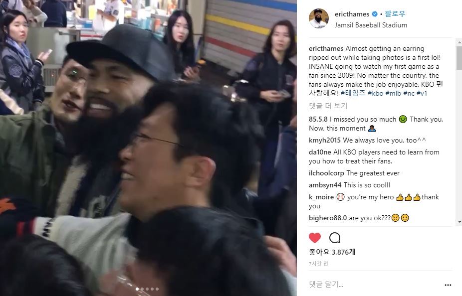 현 메이저리그 밀위키 브루어스에서 뛰고 있는 전 NC 다이노스의 간판타자 에릭 테임즈(31)가 NC 다이노스의 경기를 응원한 소감을 전했다.17일 에릭 테임즈는 자신의 인스타그램을 통해 전 소속팀 NC 다이노스의 경기를 관람한 소감을 전했다. 그는 “(팬들과) 사진을 찍으면서 귀걸이가 떨어져 나갈 뻔한 건 처음이다. 놀랍게도 2009년 이후 팬으로서 (야구) 경기를 보는 것은 처음이다”라며 “국적을 떠나, 팬들 때문에 야구선수라는 직업이 좋다”고 말했다.그는 인스타그램에 팬들과 함께 사진을 사진, 이 과정에서 귀걸이가 뜯겨 나갈 뻔한 사진, 응원 단상에 올라 NC 다이노스를 응원한 영상 등 한국에서의 추억을 담은 게시글을 올려 화제가 됐다.17일 에릭 테임즈가 자신의 인스타그램에 올린 사진들 / 사진= 에릭 테임즈 인스타그램 캡쳐
