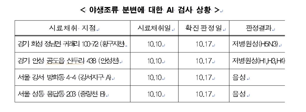 [아시아경제 김민영 기자] 최근 야생조류 분변에서 검출된 조류인플루엔자(AI) 바이러스가 모두 저병원성이나 음성 판정을 받았다. 농림축산식품부는 지난 10일 경기 화성(황구지천), 경기 안성(안성천), 서울 강서지구(A) 및 중랑천(B)에서 채취한 야생조류 분변 4건에 대한 농림축산검역본부 최종 검사결과 저병원성 AI 2건과 AI 음성 2건으로 확진됐다고 밝혔다.앞서 지난 10일 충남 서산 간월호·천수만, 서울 강서지구 및 중랑천에서 채취한 야생조류 분변 4건도 최종 검사 결과 저병원성 AI로 확진된 바 있다.저병원성 AI는 가금류에 치명적인 고병원성 AI 바이러스와 달리 전염성이 약하고 폐사가 일어나지 않는다.세종=김민영 기자 argus@asiae.co.kr<ⓒ세계를 보는 창 경제를 보는 눈, 아시아경제(www.asiae.co.kr) 무단전재 배포금지>