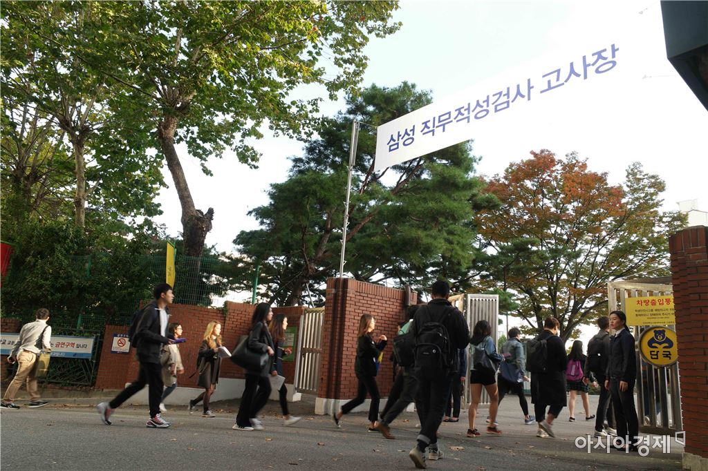 ▲22일 오전 서울 단국대부속고등학교 마련된 GSAT 고사장에 수험생들이 입실하고 있다. (제공=삼성전자)