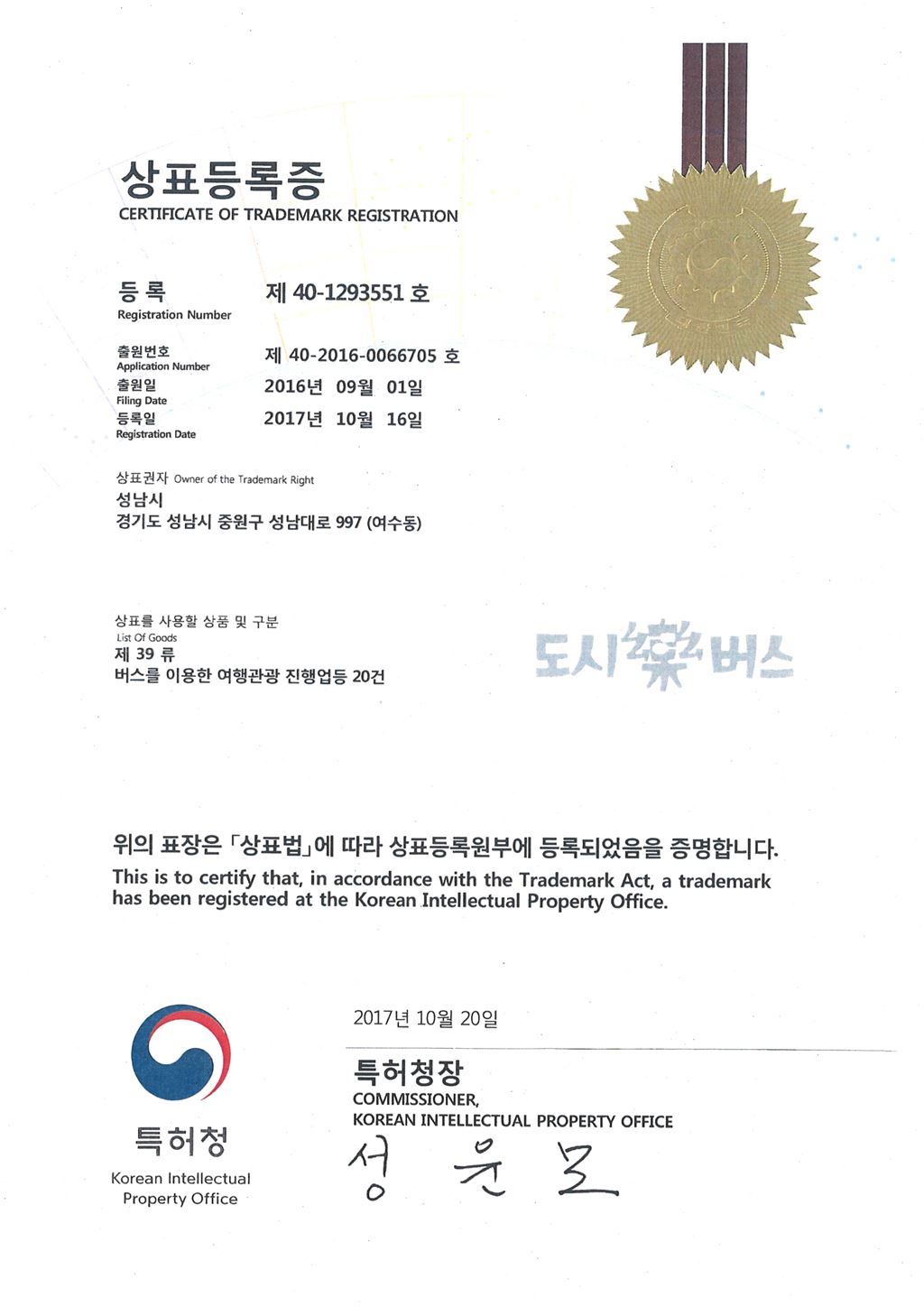 성남시의 도시락(樂)버스 상표등록증