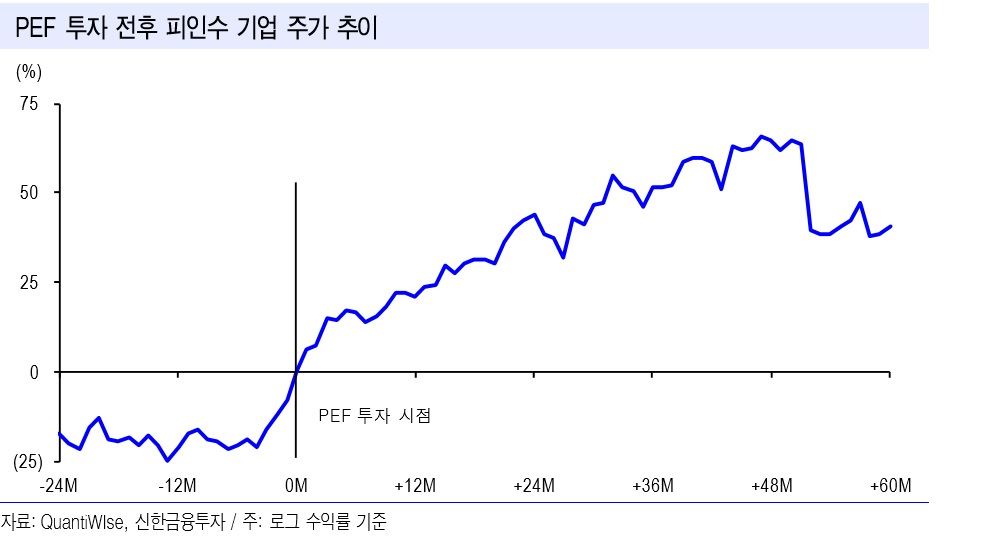 [아시아경제 박선미 기자]사모펀드가 인수하거나 지분투자한 기업에 투자하면 높은 수익률을 기대할만 하다는 조언이 나왔다.25일 신한금융투자가 발간한 '사모펀드가 선택한 기업' 보고서에 따르면 사모펀드가 인수한 기업 주가 평균은 4년 후 45.6%까지 상승했다. 특히 사모펀드가 투자한 시점에 주가는 2년 전 주가 대비 평균 17% 상승했다. 재무구조 악화, 업황 악화 기업의 경우 사모펀드 피인수 이벤트가 주가 상승 재료로 작용하기 때문이다. 일반적으로 사모펀드가 기업 경영권이나 지분을 인수하는 이유는 수익률 극대화다. 반대로 기존 오너가 사모펀드에 경영권을 매각하는 이유는 재무구조 개선, 경영 효율성 제고와 해외 진출 등으로 나눌 수 있다. 노동길 신한금융투자 연구원은 "피인수 기업 입장에서 재무구조 개선과 경영효율화, 외형 확장, 해외 진출은 주가에 긍정적인 요인"이라며 "재무구조가 악화돼 있었던 기업은 사모펀드로의 피인수 자체가 주가 상승 요인이 될 수 있다"고 설명했다.지난해 기준 사모펀드 수는 383사로 2009년 대비 3.5배 성장했다. 투자자의 사모펀드 출자 약정 대금은 62조2000억원으로 2009년 대비 241% 증가했다. 향후 사모펀드 규모는 더욱 확대될 공산이 크다. 사모펀드 규모 확대를 예상할 수 있는 배경은 크게 세 가지로 요약된다 . 첫째 기업 구조조정 시 유동성 공급 중요성이 커지는 만큼 정부는 사모펀드 규제를 완화할 가능성이 높다. 둘째 연기금 대체투자 규모 확대다. 국내 사모펀드 주요 투자자(LP)는 연기금, 공제회 등 공적기관인데, 공적기관이 대체투자 등 포트폴리오 다변화 추세에 있음을 감안하면 향후 연기금 견인 규모 확대가 지속될 것이란 전망이 나온다. 셋째 중소·벤처기업 지분투자 사례도 증가하고 있다. 노 연구원은 "사모펀드 규모 확대로 사모펀드가 주식시장에 미칠 영향도 점차 커질 것"이라며 "사모펀드가 인수하거나 지분투자를 한 기업에 주목하는 것도 좋은 투자 전략"이라고 강조했다.
