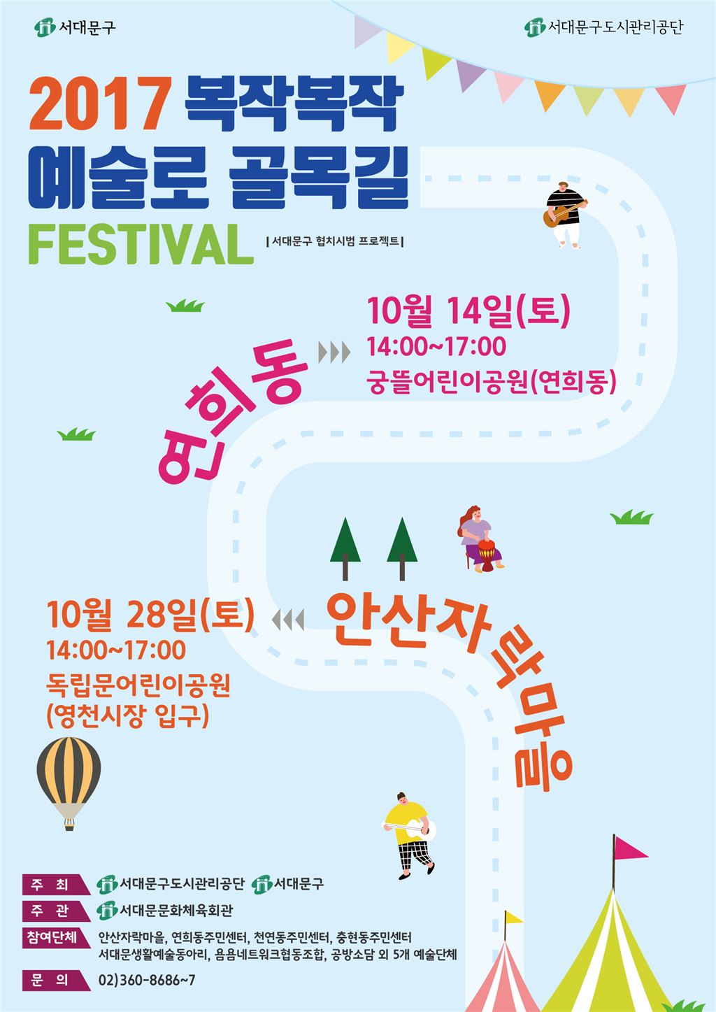 [아시아경제 박종일 기자] 서대문구(구청장 문석진)는 28일 오후 2시부터 5시까지 영천시장 입구에 위치한 독립문어린이공원에서 '2017 복작복작 예술로 골목길 축제’를 연다.이번 행사는 천연·충현동 일대 영천시장에서 충정로역에 이르는 ‘안산자락마을’이 서울형 도시재생지역으로 선정됐음을 널리 알리기 위해 주민 주도로 기획됐다.안산자락마을에서는 앞으로 5년간 물리적 생활환경 개선 뿐 아니라 경제, 사회, 문화를 포괄하는 주민주도의 도시재생사업이 추진된다.골목길 축제에서는 ‘공동체 문화를 확산해 도시재생사업을 활성화한다’는 취지에 따라 지역 주민과 예술가들이 함께 다채로운 공연과 전시, 체험 프로그램을 선보인다.서대문구 주니클체임버, 국악앙상블 ‘뒷돌’, 천연동 자치회관 오카리나 수강생, 50+ 문화예술사업단 퍼커션 연주팀, 영천시장 합창단, 구세군서울후생원 브라브밴드, 투게더 시니어 밴드 등이 이날 공연을 선서한다.