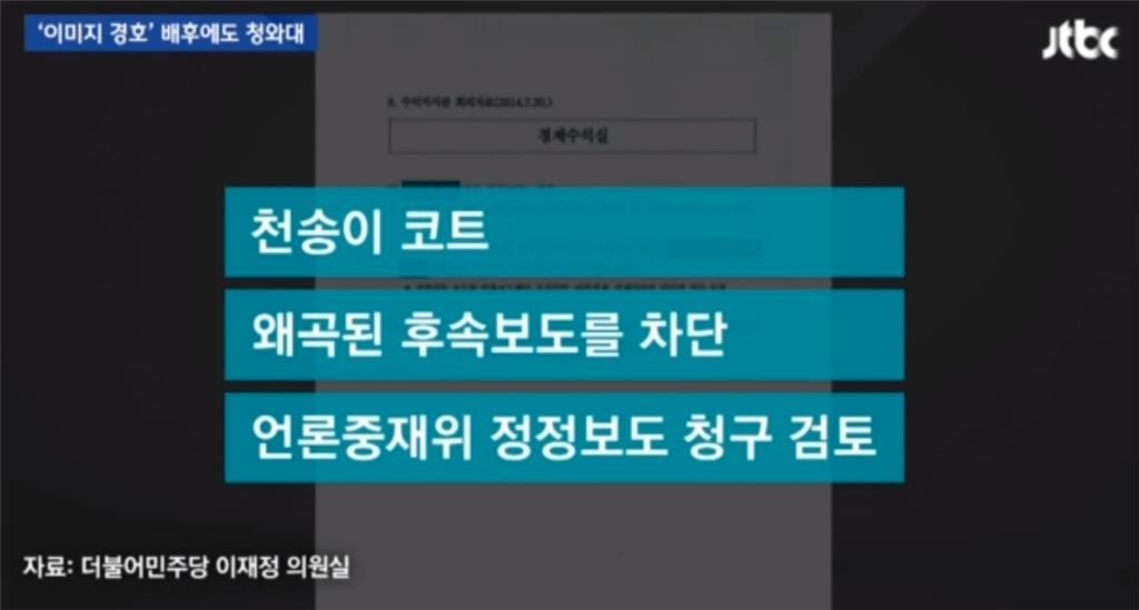 26일 JTBC가 이재정 더불어민주당 의원실을 통해 입수한 문건에 따르면 박 전 대통령의 ‘천송이 코트’ 발언이 잘못됐다는 기사의 후속보도를 차단시키고 해당 언론에 대한 법적 대응 검토 지시가 담겼다. /사진=JTBC 뉴스룸 캡쳐<br />