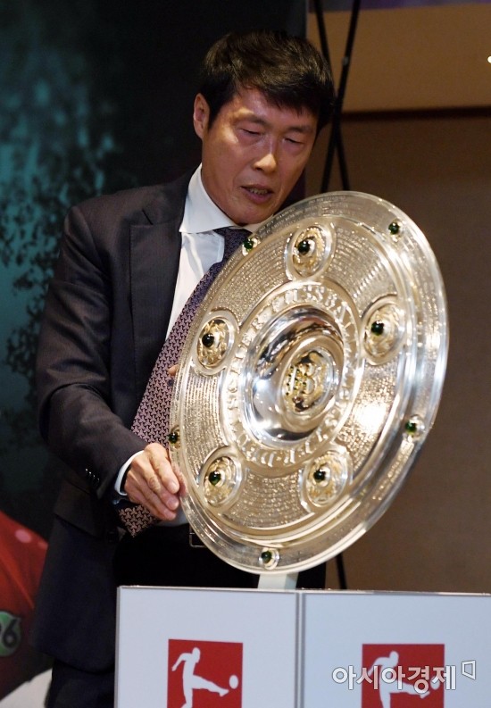 차범근 전 감독이 2일 서울 용산구 그랜드하얏트 호텔에서 열린 '분데스리가 레전드투어 IN 코리아' 공식기자회견에서 마이스터샬레를 샬펴보고 있다.이번 투어가 4일까지 한국에서 개최된다. 차범근 전 감독은 분데스리가 레전드 자격으로 이번 행사에 참여한다. 차 감독은 분데스리가 내 최상위권 팀에 대한 특별한 점을 팬들에게 직접 소개할 예정이다. 또 분데스리가의 우승 트로피 '마이스터샬레'가 이번 행사를 통해 아시아에서 최초로 공개된다. 2017.11.2./김현민 기자 kimhyun81@김현민 기자 kimhyun81@asiae.co.kr<ⓒ세계를 보는 창 경제를 보는 눈, 아시아경제(www.asiae.co.kr) 무단전재 배포금지>