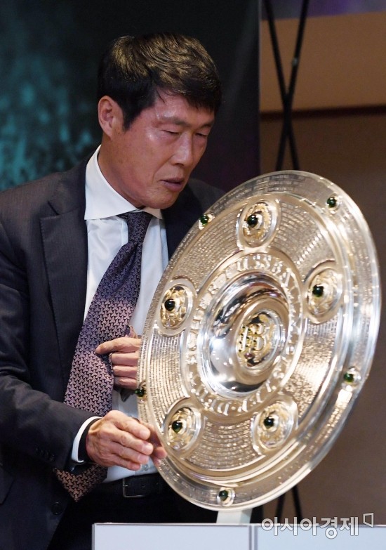 차범근 전 감독이 2일 서울 용산구 그랜드하얏트 호텔에서 열린 '분데스리가 레전드투어 IN 코리아' 공식기자회견에서 마이스터샬레를 샬펴보고 있다.이번 투어가 4일까지 한국에서 개최된다. 차범근 전 감독은 분데스리가 레전드 자격으로 이번 행사에 참여한다. 차 감독은 분데스리가 내 최상위권 팀에 대한 특별한 점을 팬들에게 직접 소개할 예정이다. 또 분데스리가의 우승 트로피 '마이스터샬레'가 이번 행사를 통해 아시아에서 최초로 공개된다. 2017.11.2./김현민 기자 kimhyun81@김현민 기자 kimhyun81@asiae.co.kr<ⓒ세계를 보는 창 경제를 보는 눈, 아시아경제(www.asiae.co.kr) 무단전재 배포금지>