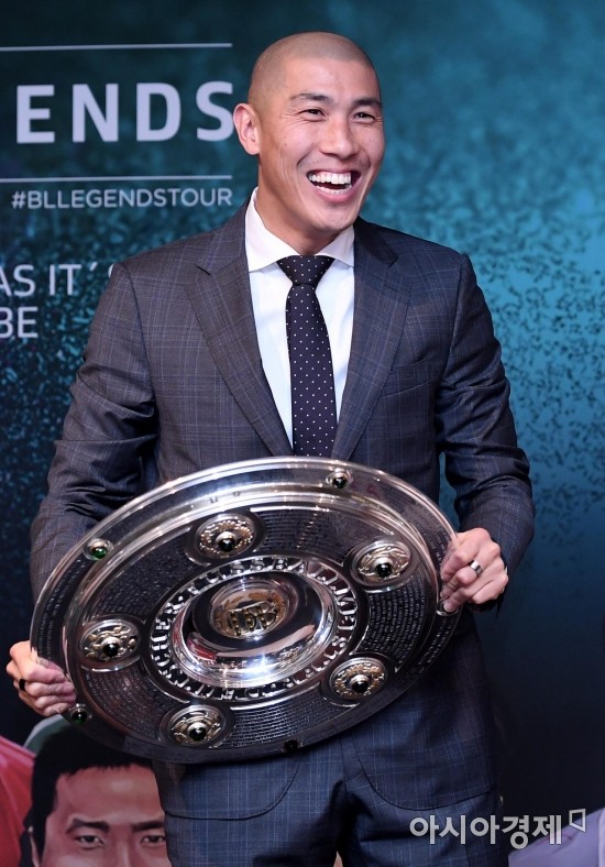 차두리 축구대표팀 코치가 2일 서울 용산구 그랜드하얏트 호텔에서 열린 '분데스리가 레전드투어 IN 코리아' 공식기자회견에서 마이스터샬레를 들어보이며 포즈를 취하고 있다.이번 투어가 4일까지 한국에서 개최된다. 차범근 전 감독은 분데스리가 레전드 자격으로 이번 행사에 참여한다. 차 감독은 분데스리가 내 최상위권 팀에 대한 특별한 점을 팬들에게 직접 소개할 예정이다. 또 분데스리가의 우승 트로피 '마이스터샬레'가 이번 행사를 통해 아시아에서 최초로 공개된다. 2017.11.2./김현민 기자 kimhyun81@김현민 기자 kimhyun81@asiae.co.kr<ⓒ세계를 보는 창 경제를 보는 눈, 아시아경제(www.asiae.co.kr) 무단전재 배포금지>