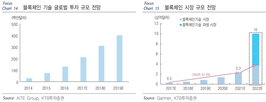 [아시아경제 박미주 기자]비트코인, 이더리움 등 암호화폐와 함께 등장한 블록체인이 시대를 변화시킬 전망으로 관련 수혜주에 주목해야 한다는 분석이 나왔다.4일 김재윤 KTB투자증권 연구원은 "현재 블록체인 기술을 보유하고 있고 이를 활용한 비즈니스를 시작하는 기업에 대한 투자가 필요한 시점"이라며 "인터넷의 등장이 아마존, 이베이, 구글을 탄생시켰듯 암호화폐와 함께 등장한 블록체인 또한 새로운 구글을 탄생시킬 것"이라고 전망했다.김 연구원은 "블록체인을 통한다면 어떠한 중앙관리체제(은행, 정부기관 등)의 인증 및 보안도 필요 없어짐에 따라 수수료 등 제반 비용이 사라지게 된다"며 "궁극적으로 암호화폐를 통해 카드회사, 결제회사 없이 결제가 진행되고 은행 없이 개인간 송금이 진행되며, 저축 계좌 없이 화폐의 저장이 가능하며 주식 계좌 없이 주식 거래가 가능케 된다"고 설명했다.가트너에 따르면 블록체인 시장은 올해 3억달러에서 2022년까지 약 100억달러가 될 것으로 전망된다. 김 연구원은 "현재 업종을 따지지 않고 블록체인을 활용한 사업모델이 등장하고 있고, 이러한 움직임은 선진국 특히 금융권을 중심으로 확산되고 있다"며 "블록체인의 P2P 성격을 활용하면 자금력이 약한 중소업체, 스타트업의 혁명이 가능하다"고 부연했다.국내 블록체인 수혜주로는 SBI핀테크솔루션즈, 아이씨케이를 꼽았다.SBI핀테크솔루션즈는 '최선호주'로 제시했다. 이 회사는 블록체인 기술을 활용한 리플 네트워크(Ripple Network)로 일본-태국간 국제 송금서비스 제공 중이다. 김 연구원은 "기존 국제 송금서비스 대비 대폭 낮은 수수료를 통한 일본 내 시장 점유율 확대가 기대된다"며 "국내에서도 국제 송금서비스를 시작할 예정"이라고 전했다.아이씨케이는 블록체인 환경 수혜주로 제시했다. 아이씨케이는 지난 5월 미국 럭셔리(Luxury) 카드사 향 600만달러 규모의 메탈카드를 추가 공급하기로 계약했다. 김 연구원은 "자체 보유 블록체인 기술을 활용한 TSM 시스템의 내년 구축 또한 기대된다"고 짚었다.박미주 기자 beyond@asiae.co.kr<ⓒ세계를 보는 창 경제를 보는 눈, 아시아경제(www.asiae.co.kr) 무단전재 배포금지>