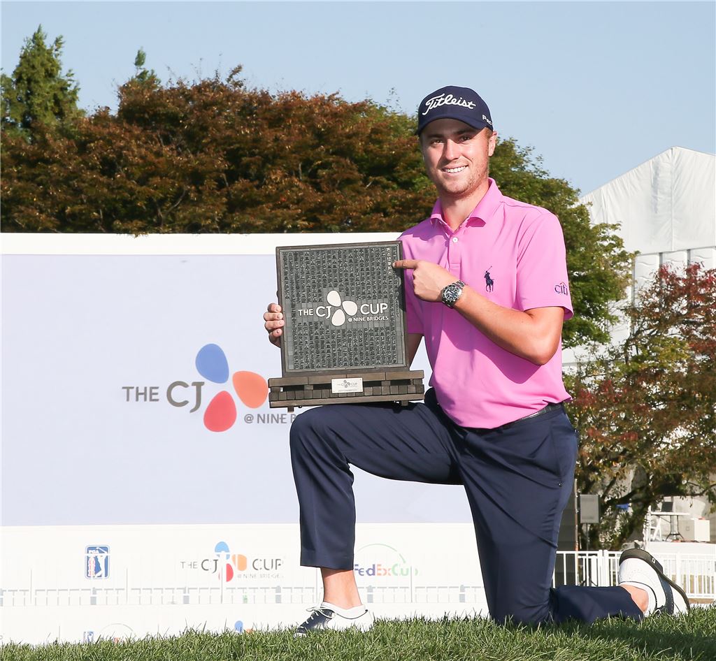 저스틴 토머스가 더CJ컵 초대 챔프에 오른 뒤 직지심체요절을 모티브로 제작한 트로피를 들고 환호하고 있다.