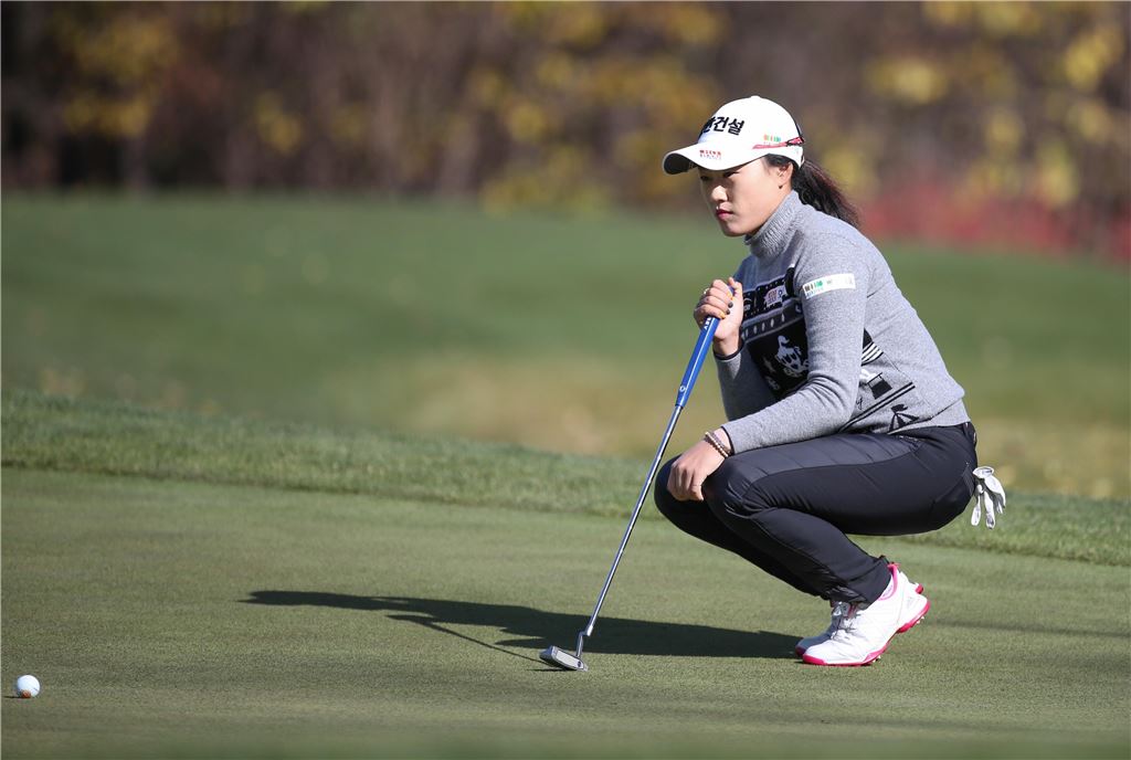 지한솔이 ADT캡스챔피언십 둘째날 5번홀에서 퍼팅 라인을 읽고 있다. 사진=KLPGA