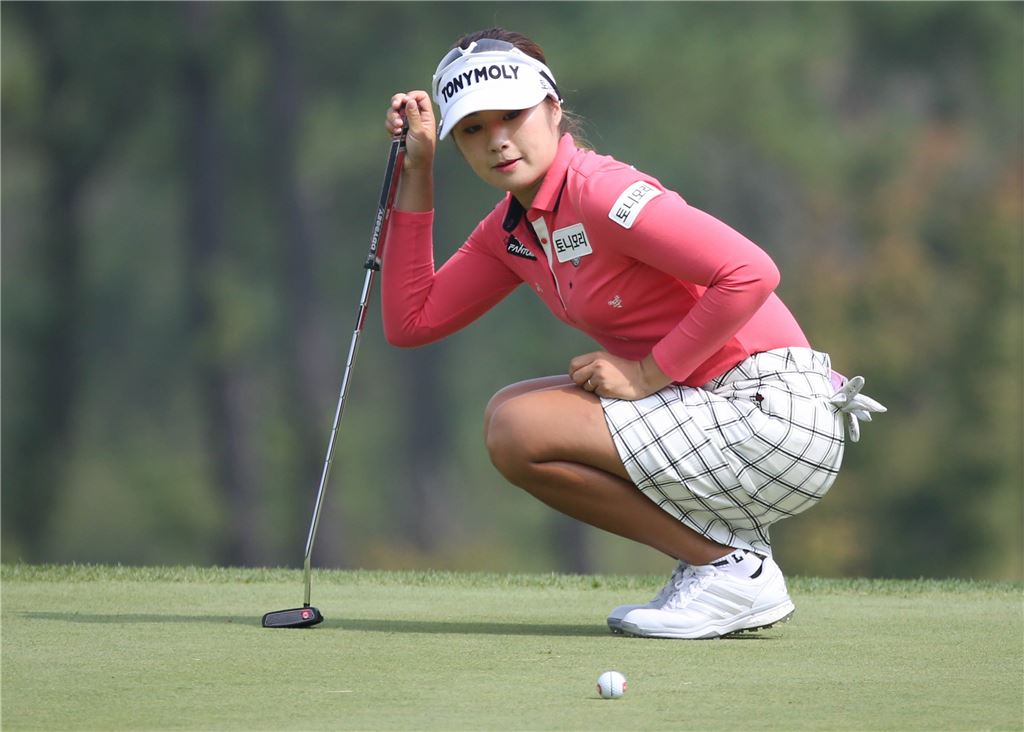 이정은6는 착시 현상을 줄이기 위해 정면이 아닌 옆에서 퍼팅 라인을 읽는 독특한 루틴을 갖고 있다.