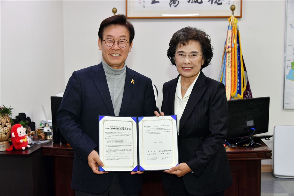 이재명 성남시장(왼쪽)이 고석주 한국빠이롯드만년필㈜ 대표와 ‘성남제1공단 역사 기록·보존에 관한 협약서’를 체결한 뒤 기념사진을 찍고 있다