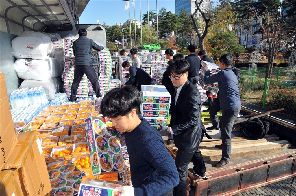 성남시와 자원봉사센터 직원들이 포함 지진피해 현장에 보낼 구호물품을 차량에 싣고 있다.