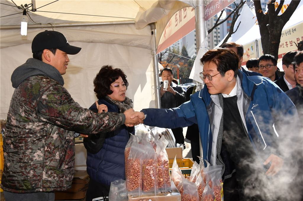 이재명 성남시장(오른쪽)이 경기농산물축제 현장을 찾아 직거래장터에 참여한 농민과 악수를 나누고 있다.