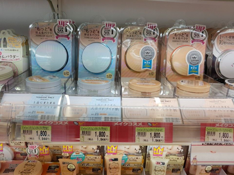 일본 야마구치시 야마구치현에 위치한 헬스&뷰티 드러그스토어 이와사키 체인에는 한국 화장품(K-뷰티) 1세대 브랜드숍 미샤의 '텐션팩트'와 '매직 쿠션'이 시세이도 등 일본 현지 화장품 브랜드의 제품과 나란히 진열돼 있다.(사진=조호윤 기자)