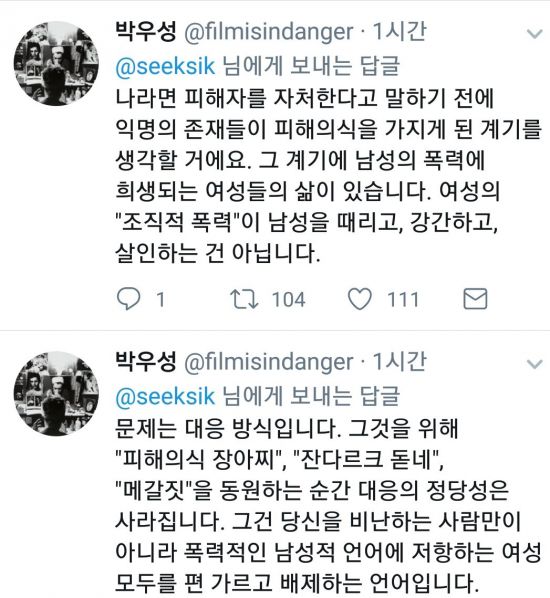박우성 영화평론가가 유아인의 반박에 재반박했다.27일 박우성은 자신의 트위터를 통해 “나는 김홍중이 쓴 ‘마음의 사회학’이라는 책의 2장, 3장을 바탕으로 ‘속물’을 썼습니다. 그의 속물론은 학계에서 유명합니다”라며 “범박하게 정리하자면 그것은 진정성, 참된 자아, 내면 공간에 갇혀 외부와 교섭하는 창문이 희박해진, 자기 생각에 대한 의심이 약한 ‘평범한’ 유형을 지칭합니다”라고 말했다.이날 박우성은 지난 25일 온라인상에서 네티즌과 설전을 벌이는 유아인에게 ‘속물’이라고 지칭한 뒤 “평론이 아니고 현상에 대한 비판도 아니고 한 사람에 대한 ‘비난’이자 ‘판단’으로 보이는데 제가 잘못 보았나요?”라고 유아인에게 비판받았다.이어 박우성은 “문제는 대응 방식입니다. 그것을 위해 ‘피해의식 장아찌’, ‘잔다르크 돋네’, ‘메갈짓’을 동원하는 순간 대응의 정당성은 사라집니다”라며 “그건 당신을 비난하는 사람만이 아니라 폭력적인 남성적 언어에 저항하는 여성 모두를 편 가르고 배제하는 언어입니다”라고 지적했다.그러면서 “나라면 피해자를 자처한다고 말하기 전에 익명의 존재들이 피해의식을 가지게 된 계기를 생각할 거에요”라며 “그 계기에 남성의 폭력에 희생되는 여성들의 삶이 있습니다. 여성의 ‘조적직 폭력’이 남성을 때리고, 강간하고, 살인하는 건 아닙니다”라고 설명했다.또 그는 “데이트 폭력으로 3일에 1명의 여성이 살해당합니다. 저라면 이 참혹한 실태부터 생각할 거에요”라며 “이 상황을 모른 척할 때야 비로소 피해자의 이름이 무기로 보이고 메갈리아를 ‘메갈짓’이라 당당하게 말할 수 있죠. 사과를 바라지 않아요. 그저 제시된 논리가 틀렸다고 말할 뿐입니다”라고 덧붙였다.박우성은 “선택하지 않았으나 남자라는 기득권으로 태어나 어쩔 도리 없이 가해 집단에 소속된 한 인간으로서 실존하는 모든 여성들의 인권 신장과 피해 회복, 상처의 치유를 위해 돕겠다”는 유아인의 말에 “예, 그 길 가세요. 나는 선택하지 않은 남자라는 기득권을 부여하고 공고히 하는 한국의 기울어진 구조, 그리고 그걸 통칭하는 ‘한남 카르텔’에 저항할게요”라고 반박했다.이어 “지금의 멘션도 그 일환입니다. 그것이 여성이 애초에 상처를 치유할 필요가 없는 세상을 위한 지름길이니까요”라며 “저 역시 페미니즘 이슈조차 두 한남의 대결 서사로 환원되는 것 자체가 한국사회의 부당한 기울기를 증명하니까요”라고 마무리했다.한편 박우성은 이날 앞서 비난한 유아인에게 “평론가의 사회적 역할과 고뇌를 조심스럽게 들여다보니 손쉬운 ‘평가’에 중독되어 타성에 젖은 한 ‘인간’이 보입니다”라는 지적을 당한 뒤 “저한테 하듯이 다른 분께 했든가, 다른 분한테 했듯 저한테 했어야죠. 이것만으로 ‘남자들’은 이미 기득권인 거에요”라고 비판했다.온라인이슈팀 issue@asiae.co.kr<ⓒ세계를 보는 창 경제를 보는 눈, 아시아경제(www.asiae.co.kr) 무단전재 배포금지>