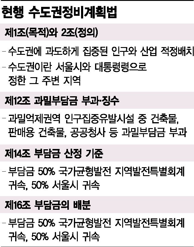 과밀부담금은 과밀억제권역에서 인구집중 유발시설 중 업무용 건축물, 판매용 건축물, 공공 청사 등의 대형건축물을 만들 경우 부과하는 부담금이다. 수도권의 인구집중 유발시설 신·증축을 억제하고 국가 균형발전을 돕고자 1994년 도입됐다.… 업무용 또는 복합용 건물 중 연면적 2만5000㎡ 이상, 판매용 건축물 중 연면적 1만5000㎡ 이상, 공공청사 중 연면적 1000㎡ 이상이 과밀부담금 부과 대상이다. 부담금은 국토교통부 표준건축비를 기초로 산정한 건축비의 10%로 하되 대통령령으로 정하는 바에 따라 5%로 조정할 수 있다. 징수된 부담금의 50%는 '국가균형발전 특별법'에 따른 지역발전특별회계에 귀속된다. 또 나머지 50%는 부담금을 징수한 건축물이 있는 시도에 귀속하게 돼 있다. 수도권정비계획법에 따른 수도권의 정의는 서울시와 대통령령으로 정하는 그 주변지역으로 규정돼 있다. 현재 과밀부담금은 서울시만 부과하고 있다. 과밀부담금의 50%는 서울시에 배분하는 구조인 셈이다. 과거에는 서울시가 과밀부담금 고지서를 발부하면 납부 의무자가 직접 은행을 방문해 현금으로 납부하도록 돼 있었지만 시행령이 개정되면서 신용카드나 직불카드로도 납부할 수 있다. 박 의원에 따르면 서울시는 1994년부터 올해 9월까지 과밀부담금 약 1조원을 배분받았다. 과밀부담금은 배분 구조를 둘러싼 논란과 함께 용도를 둘러싼 잡음이 끊이지 않았다. 올해 국정감사 때도 서울시 과밀부담금을 둘러싼 문제가 지적됐다. 박 의원은 서울시가 ▲풍납토성 복원 571억원 ▲월드컵 대교 건설 350억원 ▲서울창업허브 조성 141억원 ▲세종문화회관 극장조성 55억원 등 과밀억제 사업으로 보기 어려운 곳에 과밀부담금을 사용했다고 주장했다.