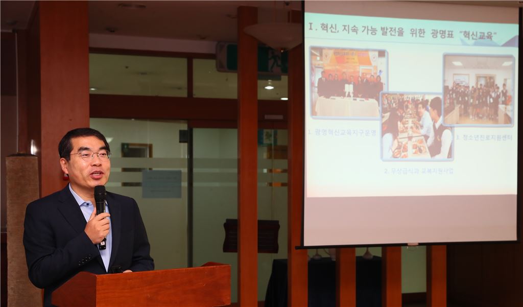 양기대 광명시장이 여주지역 초중고등학교장 리더십초청 특강에서 광명지역 혁신교육에 대해 이야기하고 있다.