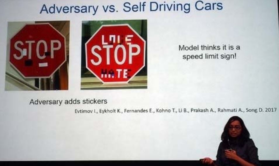멈춤(STOP))표지판에 정교한 스티커를 붙였더니 AI 이미지 인식 모델은 이를 '속도 제한'으로 오인하는 사례가 발생했다.