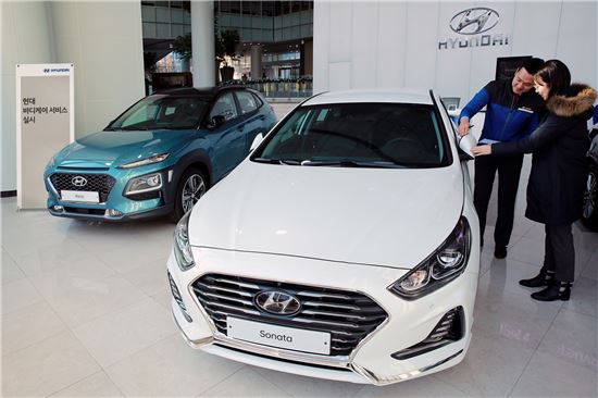 현대자동차가 전 차종에 대해 신차 구매 시 제공 받은 포인트로 차량 외관 손상을 수리 받을 수 있는 '현대 바디케어 서비스'를 실시한다고 7일 밝혔다. 고객이 사이드미러를 살펴보고 있다.<br /> <br />