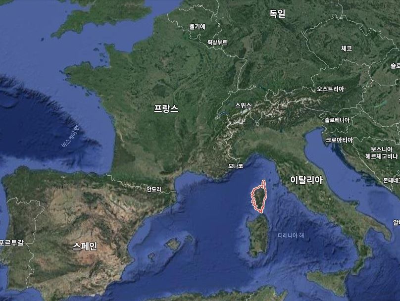 이탈리아 영토인 사르데냐섬 바로 위에 위치한 코르시카 섬(붉은 외곽선 표시) 모습. 지중해 서부 일대의 중요한 길목에 위치해 고대부터 페니키아, 카르타고, 로마, 이슬람 등 각종 세력들이 점령했으며 14세기부터 제노바의 지배를 받다가 1768년, 프랑스에 매각됐다.(사진=구글맵)