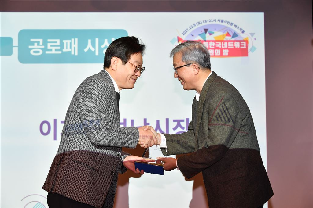 이재명 성남시장이 기본소득한국네트워크로부터 공로패를 받고 있다.
