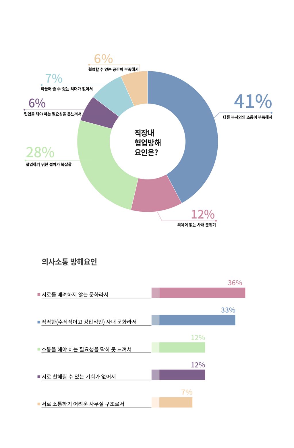 코아스, 직장인 대상 협업과 의사소통 방해 요인 설문부서간 소통 부족, 딱딱한 사내 문화 등 협업 방해 주요 요인[아시아경제 김유리 기자] 직장 내 협업과 의사소통을 방해하는 주요 요인은 '부서간 소통 부족'과 '딱딱한 사내 문화'인 것으로 나타났다. 사무가구 전문기업 코아스는 직장인 135명을 대상으로 '협업과 의사소통 방해 요인' 설문을 진행한 결과 직장인 10명 중 4명(41%)은 협업 방해 요인으로 '부서 간 소통 부족'을 꼽았다. 의사소통 방해요인으로는 10명 중 6명(69%)이 '서로 배려하지 않는 문화와 딱딱한 사내문화'를 꼽았다.협업 방해 요소는 이외에도 '협업하기 위한 절차의 복잡함' 28%, '의욕이 없는 사내 분위기' 12%, '이끌어 줄 수 있는 리더가 없어서' 7%, '협업할 수 있는 공간이 부족해서' 6%, '협업을 해야 하는 필요성을 못 느껴서' 6% 순으로 조사됐다. 의사소통 방해 요소로는 '서로 친해질 수 있는 기회가 없어서' 12%, '소통의 필요성을 못 느껴서' 12%, '서로 소통하기 어려운 사무실 구조라서' 7% 순으로 집계됐다.이번 조사는 사무환경 연구의 일환으로 기업경쟁력에서 중요한 요소인 창의적 업무 환경을 위한 조직 문화 개선점을 알아보기 위해 진행됐다. 코아스 관계자는 "창의력이 곧 경쟁력이 되는 시대"라며 "창의적 성과를 위한 구성원들의 협업과 소통은 기업 혁신의 출발점으로 이를 위한 조직 문화와 업무 환경에 대해 다양한 고민이 이뤄져야한다"고 말했다.한편 코아스는 업무 환경 개선을 위한 사무환경진단프로세스 '위드(WITH)'를 무료로 제공하고 있으며 자사 홈페이지와 모바일을 통해 신청할 수 있다.김유리 기자 yr61@asiae.co.kr<ⓒ세계를 보는 창 경제를 보는 눈, 아시아경제(www.asiae.co.kr) 무단전재 배포금지>
