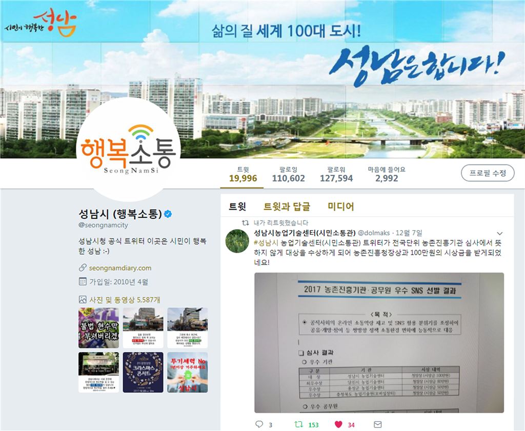 [아시아경제(성남)=이영규 기자] 경기도 성남시 농업기술센터의 트위터 계정이 농촌진흥청이 뽑은 홍보 대상 수상 콘텐츠로 선정됐다. 성남시 농업기술센터 트위터는 시가 운영하는 145개 부서 트위터 계정 중 하나다. 현재 전국의 농정시책과 농촌진흥사업을 공유 확산해 영농 관련 정보를 빠르게 전달하고 있다. 특히 실시간 댓글과 답변으로 영농사업에 관한 시민 참여와 관심을 유도하고 있다는 평이다. 성남시는 SNS 공식 계정인 '성남시(행복소통)'와 이재명 시장 계정, 각과 145명의 시민소통관이 운영하는 트위터 등을 운영하고 있다. 성남시의 SNS 행정은 2012년 8월 135명의 SNS 시민소통관이 활동하면서 시작됐다. 5년이 지난 현재 '성남시(행복소통)' 팔로워 수는 12만7594명이다. 이는 전국의 17개 광역자치단체, 226개 기초자치단체 중 가장 많다. 성남시는 트위터 외에도 페이스북, 블로그, 인스타그램, 카카오톡 플러스 친구 등 다양한 채널을 통해 시민과 소통하고 있다. 최근에는 남녀노소 누구나 사용하는 카카오톡 플러스 친구를 늘려 시민 누구나 손쉽게 시정 정보를 접근할 수 있도록 하고 있다. 한편 이번 농촌진흥청 홍보대상 시상식은 오는 21일 농촌진흥청 대강당에서 열린다.이영규 기자 fortune@asiae.co.kr<ⓒ세계를 보는 창 경제를 보는 눈, 아시아경제(www.asiae.co.kr) 무단전재 배포금지>