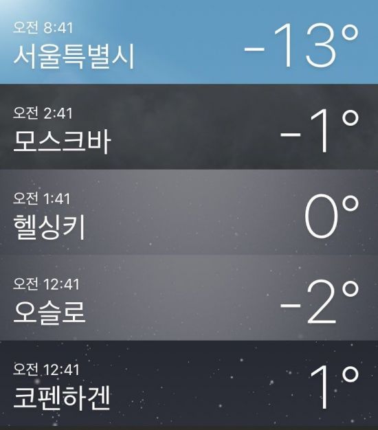 [아시아경제 이현우 기자] 무시무시한 동장군이 한반도 전역을 덮치면서 서울에도 올겨울 들어 처음으로 한파주의보가 내려졌다. 북극진동과 지구온난화가 겹쳐 일어난 한파로 북극권의 찬 기단이 한반도에 집중되면서 한국이 주요 북구권 나라들보다 훨씬 낮은 기온을 기록하고 있다. 기상청에 따르면 12일 서울의 아침 최저기온은 영하 12.2도를 기록했다. 오전 9시를 기해 서울ㆍ남양주ㆍ양평ㆍ김포ㆍ철원ㆍ양구ㆍ인제 등 수도권ㆍ강원 일부 지역은 체감온도 '위험'(영하 15.4도 미만) 단계에 포함됐다. 체감온도가 '위험' 단계면 장시간 야외 활동시 저체온증과 함께 동상의 위험이 있다. 이날 서울에는 한파주의보가 내려졌고, 충북 제천, 강원 일대, 경기 파주ㆍ의정부ㆍ양주ㆍ포천ㆍ연천ㆍ동두천에는 한파경보가 내려졌다.(사진=네이버 날씨)